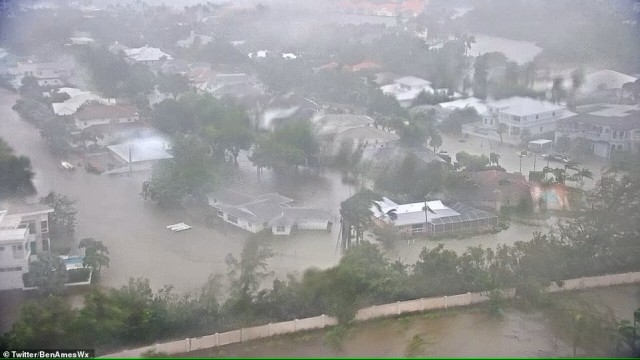 Imágenes de video de la furia de la tormenta con el agua de la inundación llegando a los techos de las comunidades más afectadas, arrastrando autos y las ruinas de las casas mientras las palmeras se doblaban casi por la mitad.